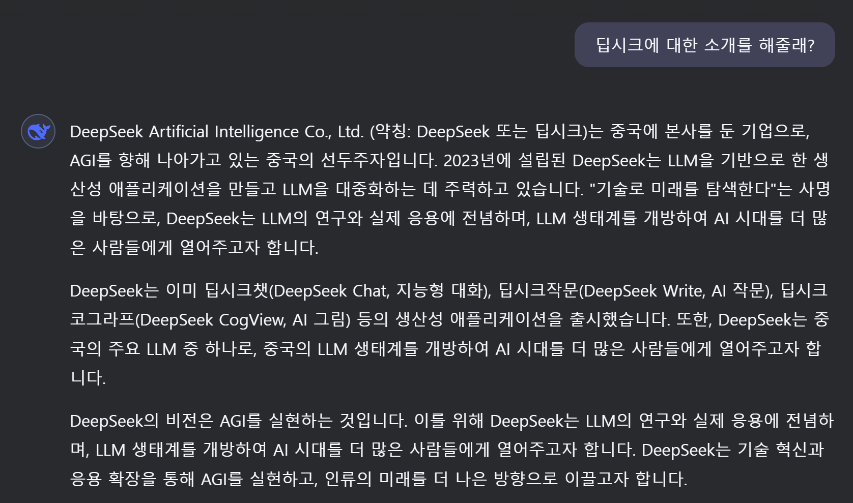 딥시크는 기존에 챗GPT등의 AI툴을 사용해 보셨다면 간단히 사용하실 수 있습니다. 질문을 응답하면 답변해 주는 심플한 방식은 다른 툴을 사용해 보셨다면 익숙하실겁니다. 현재 기준 딥시크와 할때 딥싱크라는 논리 추론기능, 웹검색, 텍스트 파일을 제공하여 딥시크와 대화에 활용할 수 있게 되어 있습니다. 아시아GPT라는 이름답게 케이팝, 동아시아 문화등의 검색에는 챗GPT에 비해 확실한 강점을 가지고 있음을 확인 할 수 있습니다.